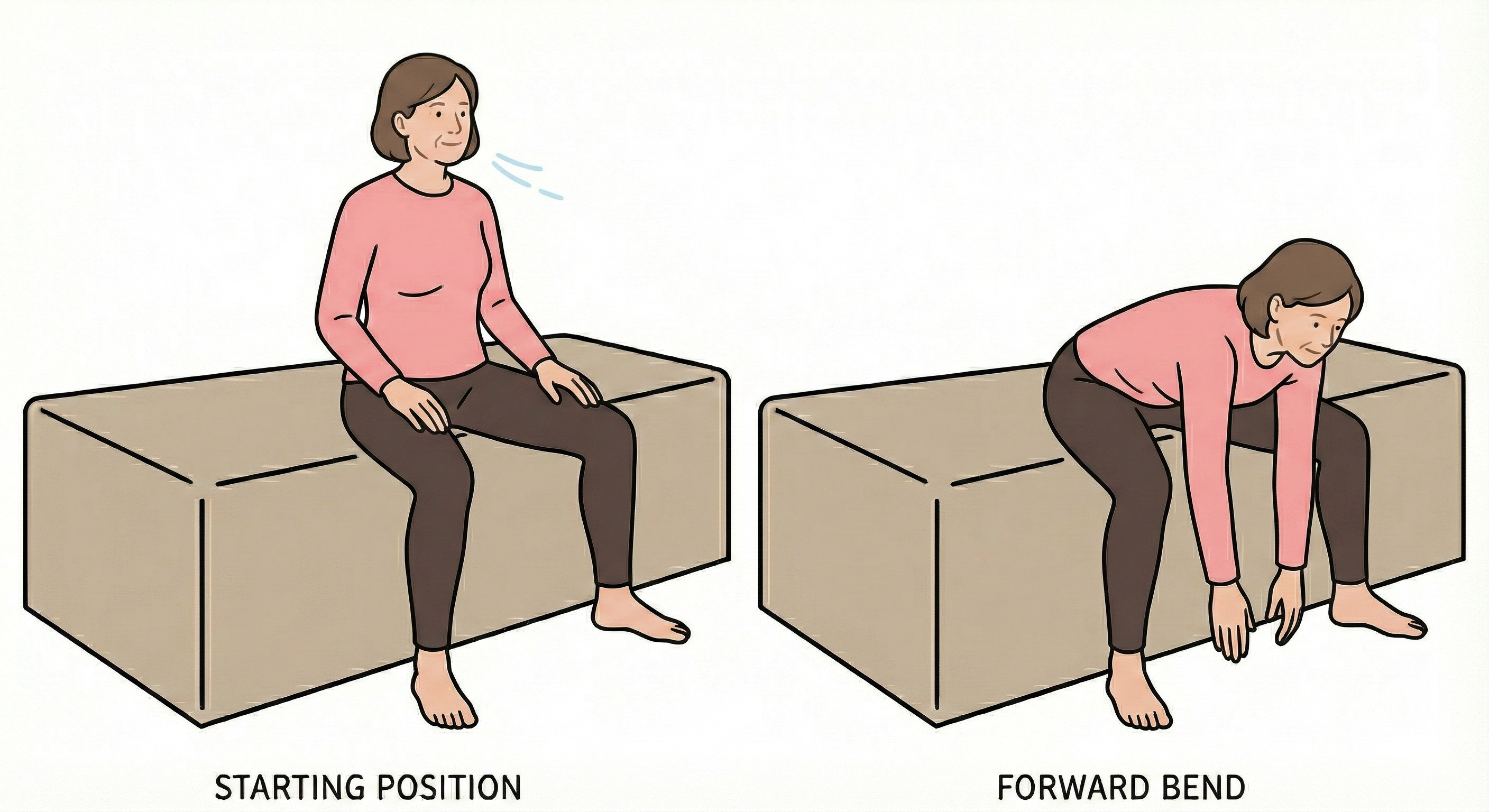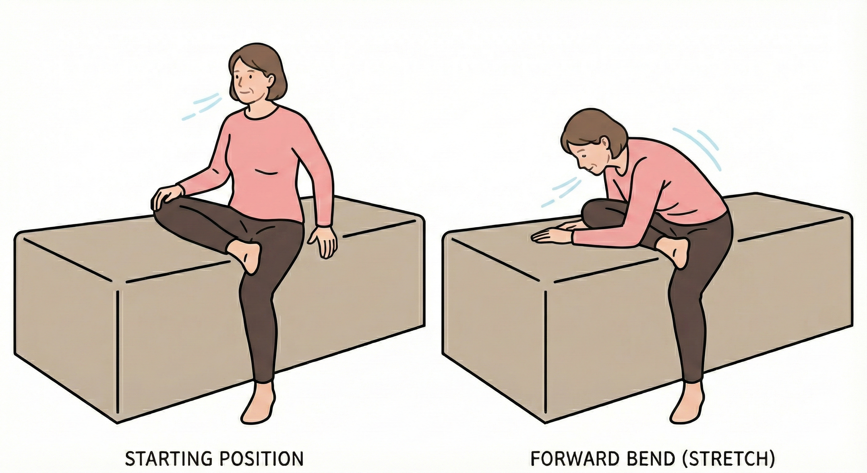 - 痛みがない範囲で、両手を使ってゆっくりと体を前に倒します。