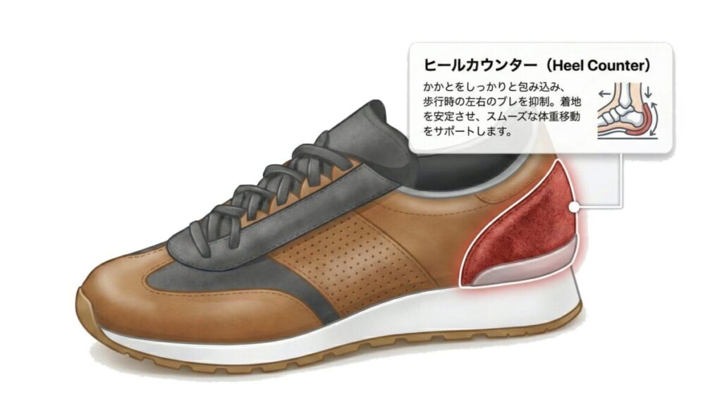 ① ヒールカウンター(踵の芯)の強度が足首を支える