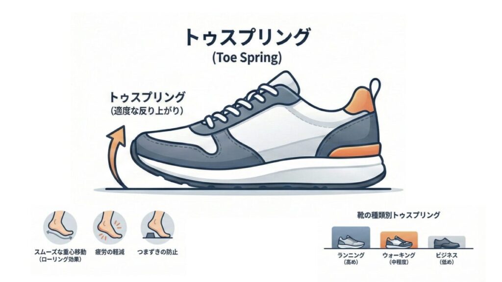 - トゥスプリング(つま先の反り): つま先が少し浮き上がった形状の靴は、遊脚期のつまずきを防止し、スムーズな体重移動(ロッカー機構)をサポートします。